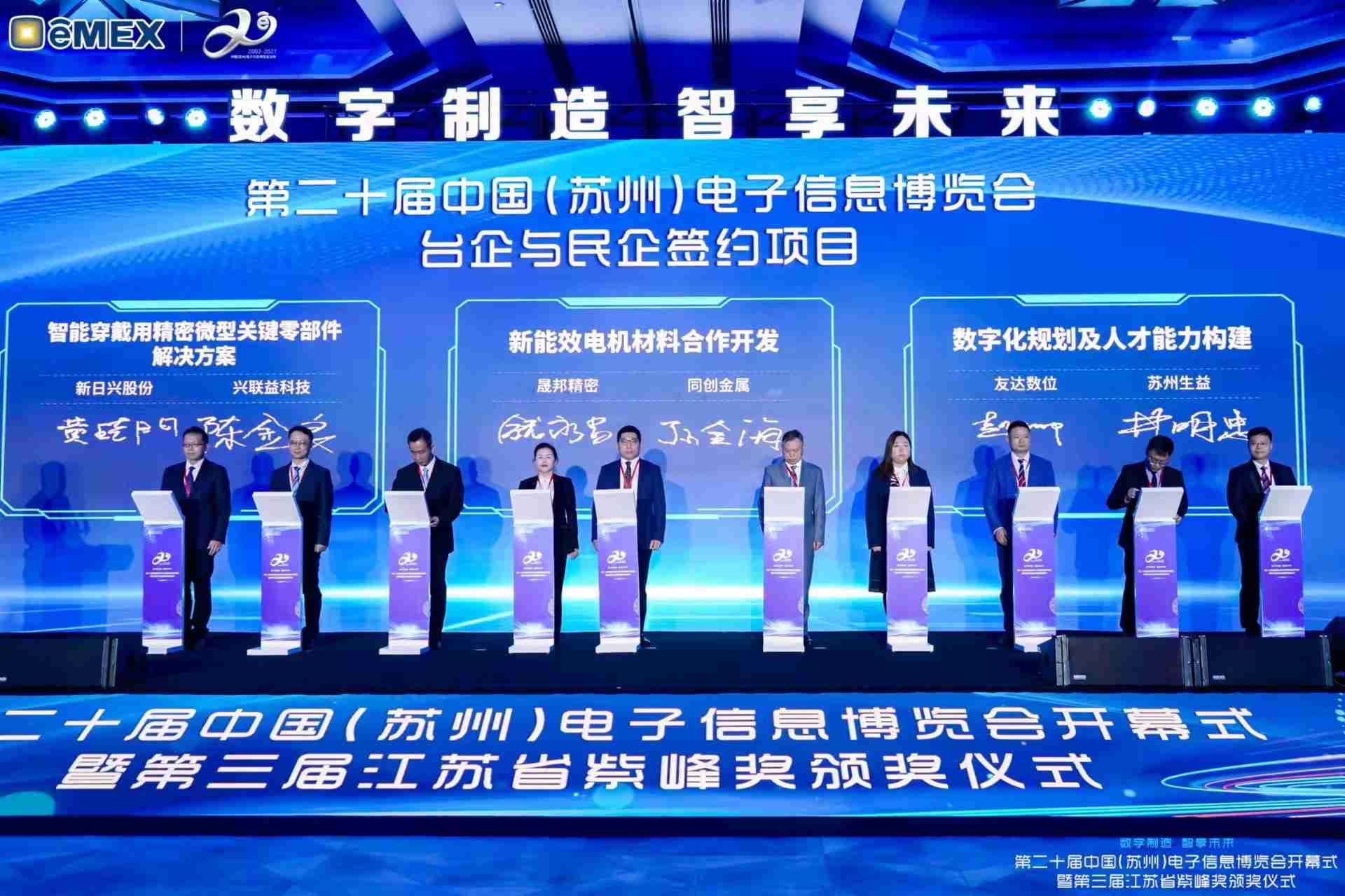 电博会开幕式当天也是第三届江苏省紫峰奖颁奖仪式,,,,省台办、、、、工信厅、、商务厅、、、苏州市相关领导均出席并颁奖。。。该奖项为表彰对江苏高质量发展做出积极贡献的在苏企业,,,,由江苏省政府专门设立。。。。2468BET光电 (苏州) 总经理郭振明代表上台领奖,,,,这也是2468BET苏州连续三次蝉联紫峰奖 出口贸易领军企业奖。。。。2468BET数位总经理赵丽娜女士,,也参与本次开幕式,,上台为本地化赋能签署战略合作协议,,,,将优质服务资源集合、、、、下沉到更多细分行业,,,,为更多地区的制造企业提供数字化转型服务。。。。