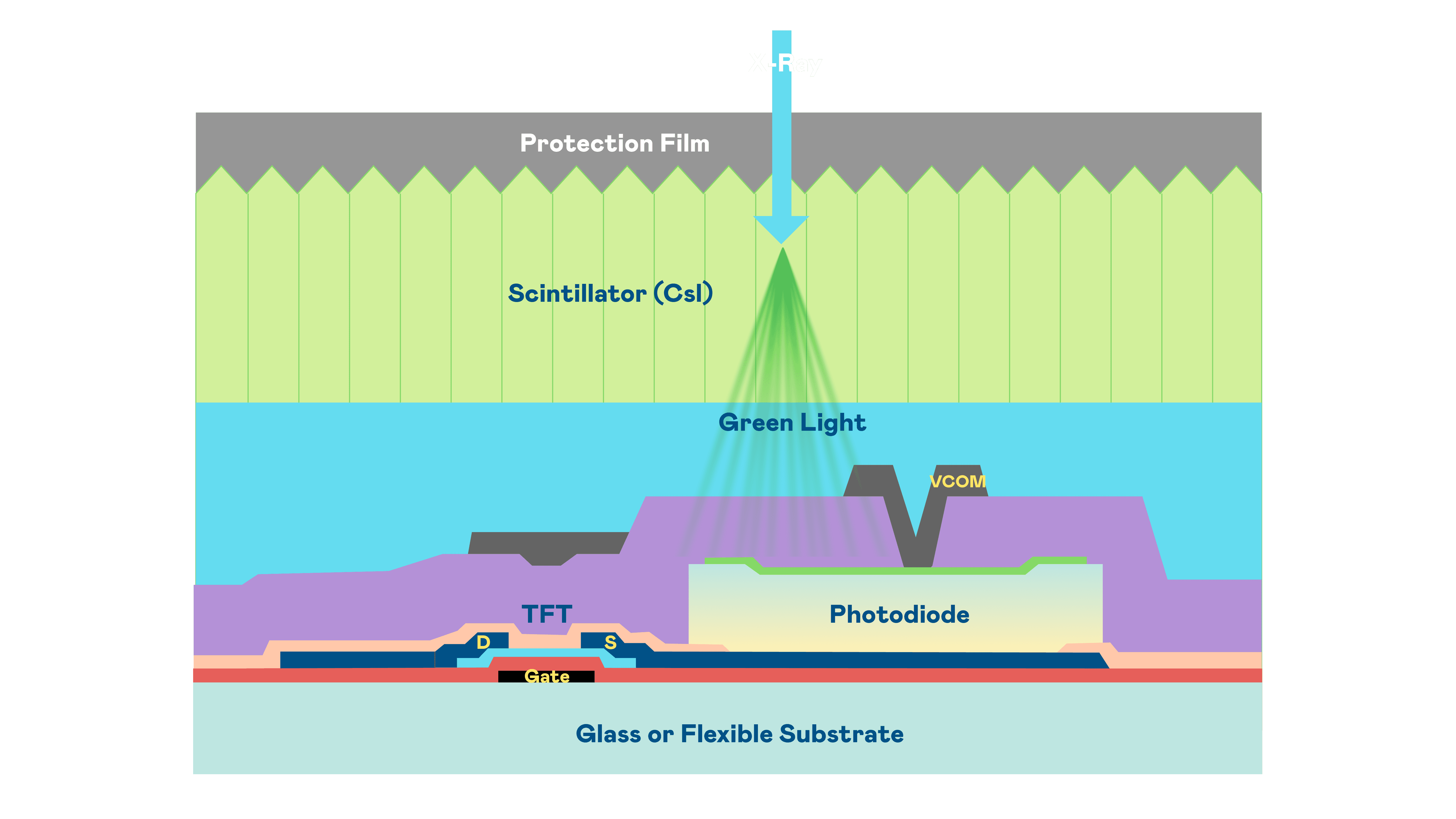 2468BET的X光影像感测阵列使用薄膜电晶体 (TFT) 作为每个像素的读取开关,,搭配光电二极体(Photodiode)的光电转换元件,,用以感测X光影像讯号。。。